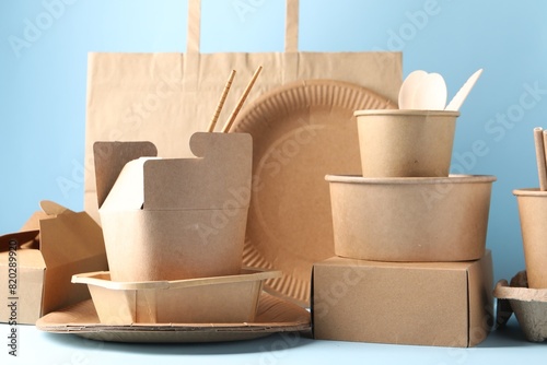 Eco friendly food packaging. Paper containers, tableware and bag on white table against light blue background