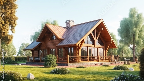 Eco House with solar panels on the roof. Sustainable and clean energy at home. Country house,near trees.(Generative Ai)