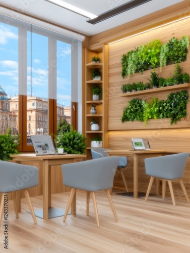 Eco Office App: Green Workspace Solution - Modern corporate office, energy efficiency, sustainable design, natural elements, technological integration. Symbolizing progress, nature, technology