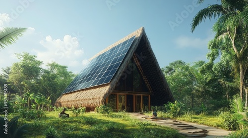 solar panel, jungle, palm tree, tropical, green energy, cabin, environmentally friendly, nature, architecture, house, forest, leaf, bamboo, green, modern, design, renewable energy, energy efficiency, environment, home, travel, vacation