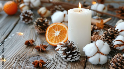 Eco-friendly Christmas table decor: white candle, dried orange, pinecones, and cotton, on wooden background