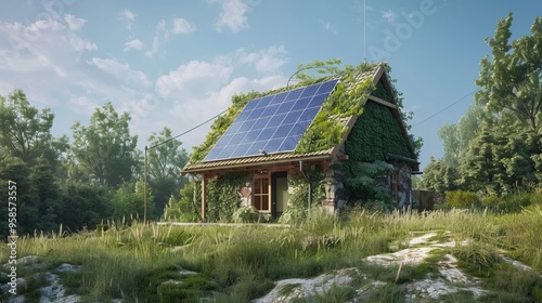 house, bungalow, solar, panel, energy, green, nature, environment, sustainable, eco, friendly, roof, grass, wood, stone, tree, sky, cloud, landscape, rural, field, meadow, outdoors, home, garden, architecture, design, summer, day, daylight, blue, digital, art, illustration, three-dimensional, rendering, concept, future, hope, clean, technology, electricity, power, conservation, earth, growth, living, peaceful
