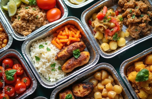 Eco-friendly lunch boxes ready for delivery. Top view of various meals. Office lunch boxes with healthy food. Prepared for takeout. Catering corporate lunch. Includes rice, vegetables, grilled meat.