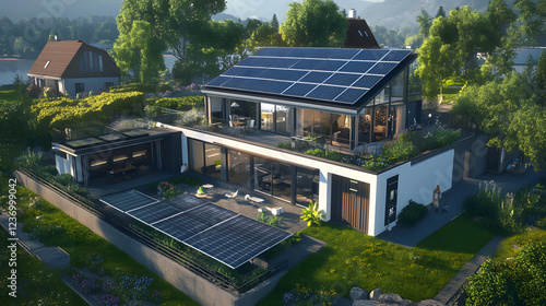 Eco-friendly smart home featuring solar energy systems and storage solutions for a sustainable future with reduced carbon footprint.