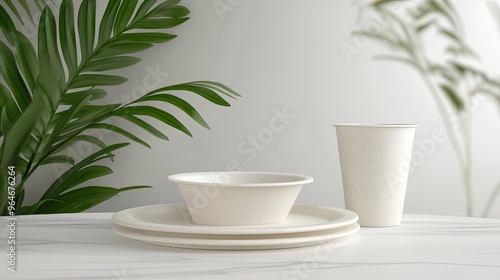 sustainability, biodegradable, disposable, tableware, plate, cup, bowl, set, natural, material, green, plant, white, background, marble, surface, product, design, minimal, modern, clean, simple, elegant, lifestyle, organic, healthy, concept, environment, ecology, reusing, recyclable