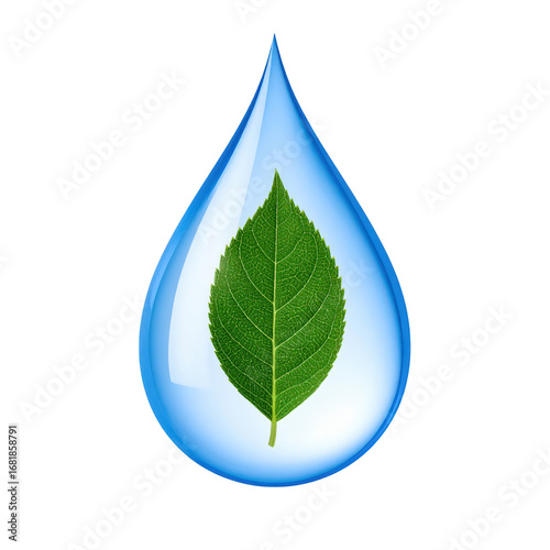Eco-Friendly Water Drop with Green Leaf Inside Over White Background Symbolizing Nature Freshness and Environmental Conservation Concept