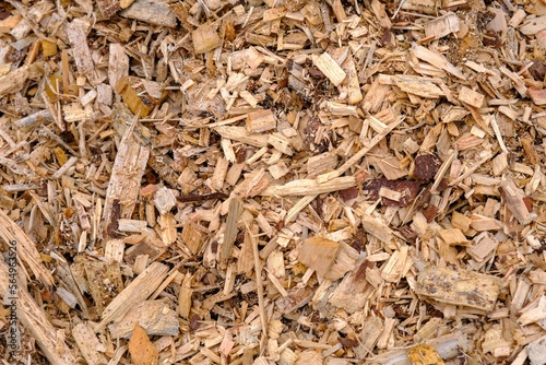 Ecological fuel wood chips used for heating. Actual fuel. A pile of wood chips for a biomass boiler. Close-up of chips, wood chips. For heating small towns