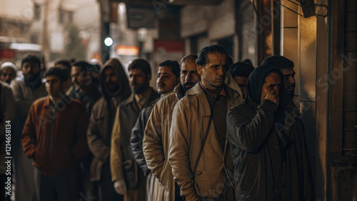 Economic emergency concept, crowd waiting in urban street at night line queue