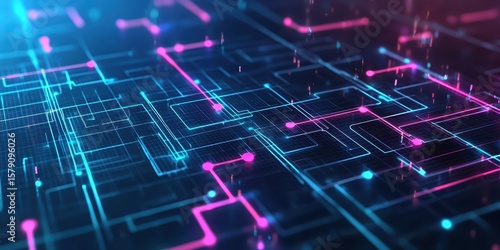 Economy charts data concept. Abstract digital circuit design with glowing lines and nodes in vibrant colors.