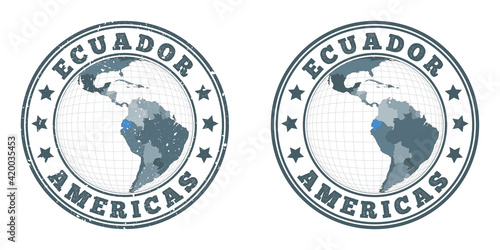 Ecuador round logos. Circular badges of country with map of Ecuador in world context. Plain and textured country stamps. Vector illustration.