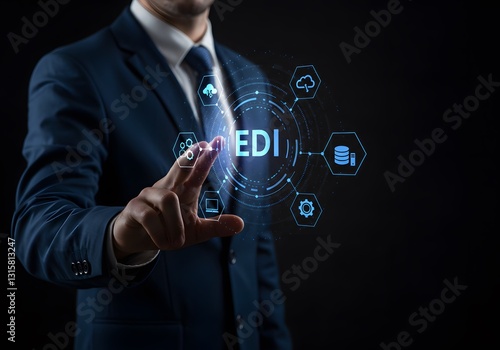 EDI, Electronic Data Interchange Concept. Businessman touching on EDI (Electronic Data Interchange) icons, information paperwork exchange in business context, global data transfer, digital security,
