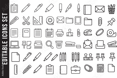Editable Outline Icon Set of Stationery, Office, and School Supplies