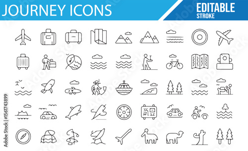 Editable vector icons for different stages of a journey, including travel, hiking, and transportation.