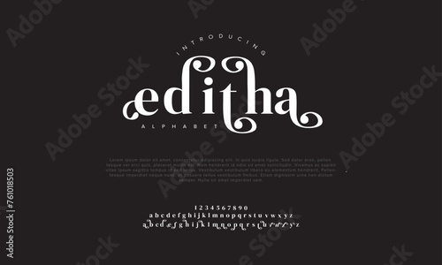 Editha premium luxury elegant alphabet letters and numbers. Vintage wedding typography classic serif font decorative vintage retro. Creative vector illustration