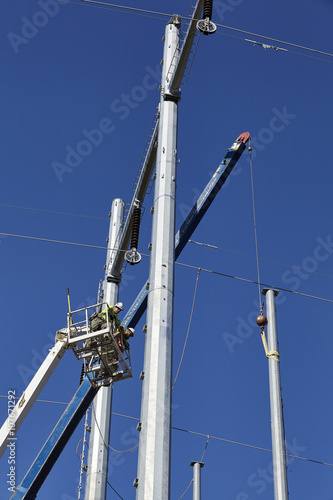 man, crew, men at work, high voltage, voltage, power, line, tower, transmission, utility, electric, electricity, utility, pole, crane, boom, lineman, repair, install, sky, dielectric, basket