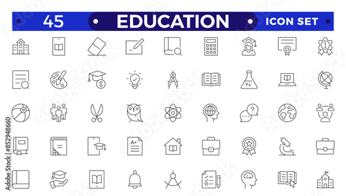 education, learning, icon, school, book, web, study, vector, back, student, outline, set, thin, pen, certificate, microscope, bag, class, test, award, desk, lesson, bell, cap, crayons, globe, diploma, medal, mathematic, computer, geography, simple, paper, board, geometry, editable, stroke, astronomy, brush, line, paint, collection, phone, symbol, design, illustration, signs, media, mail