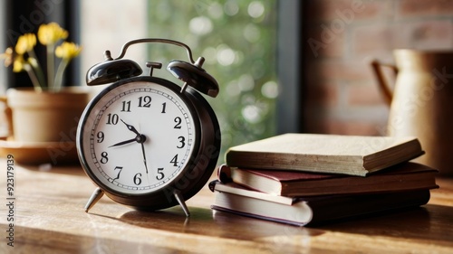 Education day arrangement on a table with a clock