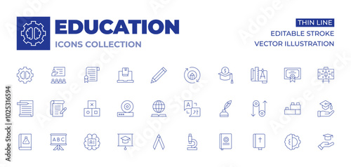 Education icons collection. Thin Line icons, editable stroke. blocks, artificial intelligence, microscope, language, bible, knowledge, pulley, precision, write, thesis, friction, education