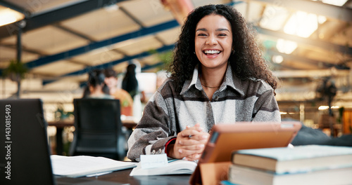 Education, portrait and student woman in library of college campus for learning or study. Books, scholarship and tablet with happy person at university for assignment, development or research