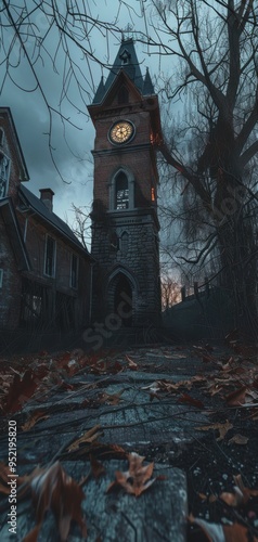 eerie, autumn, scene, old, abandoned, clock, tower, pathway, cover, fallen, vintage, invoking, texture, structure, shadow, landscape, skittish, warmth, foliage, timberland, gothic, decay, quiet, twilight, surreal
