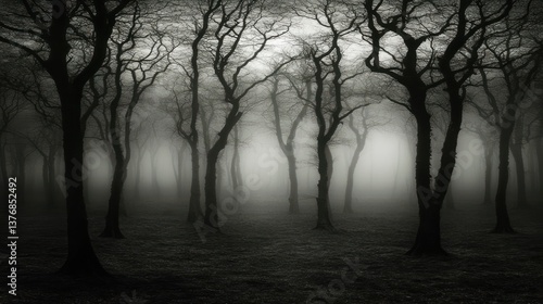 Eerie Forest Scene with Bare Trees and Foggy Atmosphere Mysterious Woods Dark Silhouettes Na