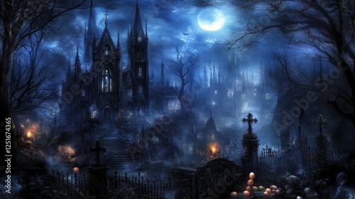 gothic, cemetery, haunting, skittish, gravestone, background, twilight, moonlight, eerie, grisly, atmosphere, night, fantasy, solemn, creepy, horror, silent, magical, dark, mysterious, moon, church, landscape, gloomy, artwork, architecture, ominous, digital, cross, surreal, stillness, design, illuminated, tranquil, blue, painting, stone, sky, light, aethereal, artistic, dense, structure, chilling, full, shadow, tree, building, silhouette