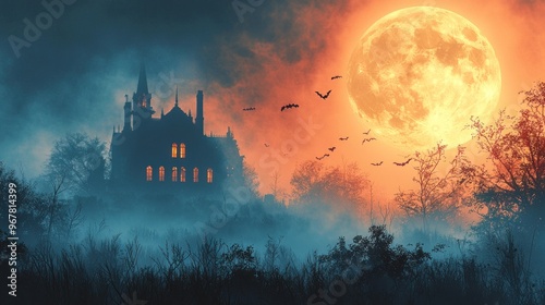 Eerie Halloween Night: Haunted House Silhouette under Full Moon with Foggy Atmosphere