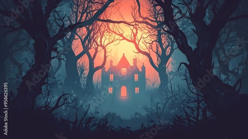 Eerie Haunted Forest with Twisted Trees and Glowing Haunted House