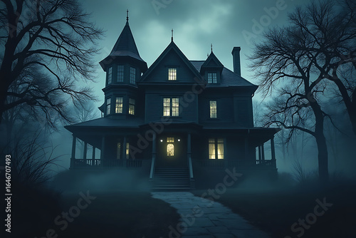 luxury home, victorian, eerie, gloomy, bare, tree, night, dark, silhouette, landscape, house, architecture, building, exterior, skittish, haunted, ominous, foreboding, mystery, night time, twilight, dusk, evening, shadow, fog, mist, obscure, gothic, style, structure, estate, property, residence, home, pathway, entrance, window, facades, design, atmosphere, mood, scene