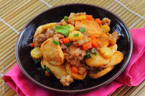 egg, tofu, cut, fried, stir, fries, pork meat, vegetable, soy, chinese, thai, food, cook, eatery, pepper, meat, meal, lunch, delicious, cooking, asia, asian, cookery, dinner, protein, slice, eat, tasty, oil, glasses, dish, wood