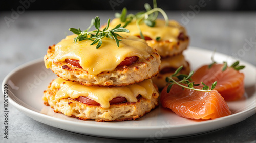 eggs benedict, salmon, breakfast, brunch, cheese, herb, plate, white, epicure, smoked salmon, muffin, sauce, yellow, green, orange, delicious, appetising, protein, savoury, eatery, homemade, culinary, fine dining, nourishment, healthy, rich, creamy, indulgent, flavorful, luxurious, elegant, sophisticated, morning, weekend, special occasion, celebration, treat, epicure, cookery, gastronomy, main course, meal, dish, receipe, cooking