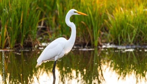 egret, bird, marsh, water, wildlife, nature, sunset, dawn, white, long, beak, grass, green, gold, light, still, photo, conservation, beauty, scenic, calm, peaceful, elegant, graceful, shoreline, habitat, stillness, tranquil, environment, serene, wetland, species, birding, birdlife