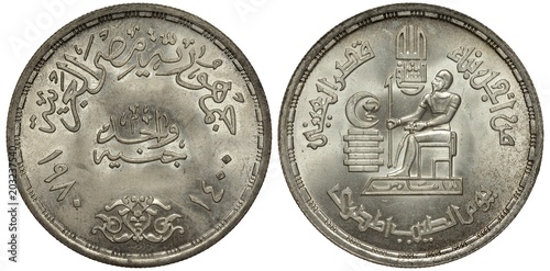 Egypt, Egyptian coin one pound 1980, inscription in Arabic script Doctor’s Day, ancient doctor sitting, bowl and snake, Red Crescent emblem, silver, light greenish patina