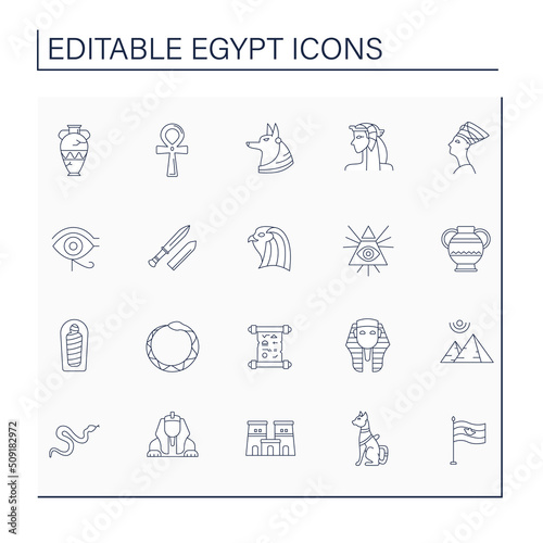 Egypt line icons set. Egyptian culture. Traditional Egyptian civilization symbols. Traveling concept. Isolated vector illustrations. Editable stroke