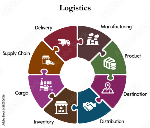 Eight aspects of Logistics - Manufacturing. Product, Destination, Distribution. Inventory, Cargo, Supply chain, Delivery. Infographic template with icons