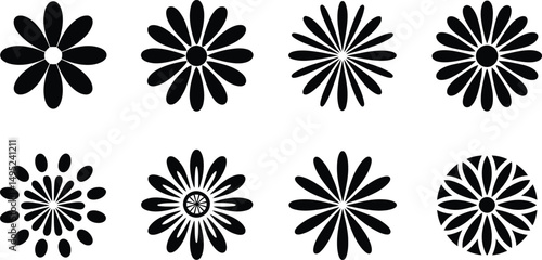 flower, floral, design, black, white, monochrome, pattern, graphic, illustration, element, symbol, icon, nature, blossom, bloom, flower petals, simple, abstract, geometric, shape, round, daisy, sun, starburst, vector, seamless, decoration, flower, wallpaper, art, spring, set, ornament, texture, summer, colours, leaf, vintage, swirl, pink, textile, snowflake