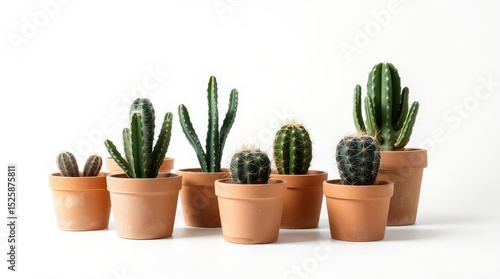 cactus, cactus, plant, pot, terracotta, ceramic, botany, flora, spine, needle, desert, arid, green, brown, earth, clay, container, white, background, collection, group, diverse, small, texture, growth, nature, still, life, display, indoor, studio, arrangement, home, decor, garden, gardening, ornamental, succulent, prickly, sharp, variety, flocked, isolated, nobody, light, sunlight, bright, minimal
