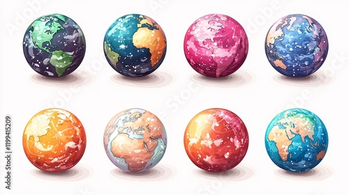 Eight colorful cartoon Earth globes, various textures and colors.