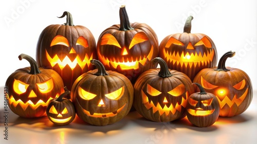 Eight sinister lit jack-o'-lanterns with wicked faces and glowing eyes stare ominously against a pure white background, exuding eerie halloween atmosphere.