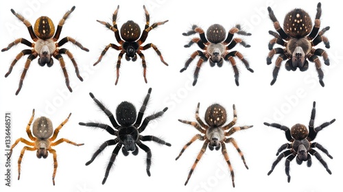 spider, arachnid, insect, zoology, entomology, wildlife, nature, animal, photo, macro, white, background, isolated, collection, variety, species, different, 8, closeup, leg, eye, body, texture, pattern, hairy, creepy, crawly, small, big, brown, black, orange, yellow, scientific, research, education, illustration, design, graphic, web, fauna, biology, invertebrate