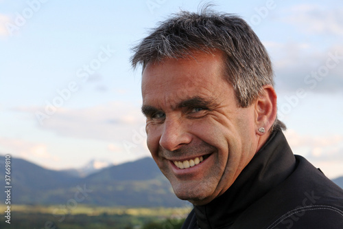 man, laugh, be glad, fun, mount, mountain, alpen, older, natural, smile, teeth, healthy, hoary, happy, portrait, occupation, male, coat, anorak, black, vision, countryside, hike, climb, fun, recreation, liberty, nature, outside, environment, weather, summer, heaven, far, interest, enjoy, view, modern, earring, fold