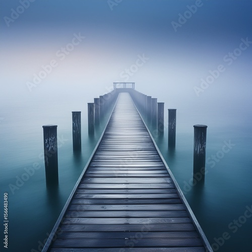 Ein nebliger Küstenblick zeigt im Dämmerlicht einen langen, schmalen Steg, der ins ruhige Meer hinausführt