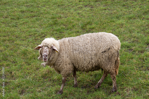 ein weißes schaf auf einer weide schaut direkt in die kamera fotografiert während eines spaziergangs in der natur norddeutschlands mit weitwinkelobjektiv
