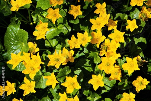 Eine Ansammlung von gelben Sumpfdotterblumen an einem Bach