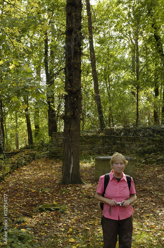 monastery, history, backpack, stone, forest, camera, standing, woman, ruin, nature