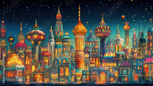 Eine futuristische Stadt mit extravaganten, farbenfrohen Gebäuden, leuchtenden Dekorationen und übergroßen Ornamenten. Die Szene ist hell erleuchtet und hat eine lebendige, futuristische Atmosphäre