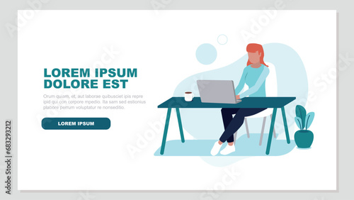 illustration, vector, office, desktop, people, computer, laptop, sitting, urgency, secretary, clip art, employee, technology, infographic, concept, table, coffee, plant, chair, cyberspace, businesswoman, woman