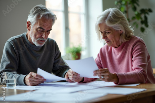 two people, paperwork, retirement, togetherness, wife, living room, planning, serious, advice, contract, cooperation, discussion, expertise, assistance, investment, meeting, pen, reading, showing, sofa, strategy, manager, talking, suit, document, photo, banking, businesswoman, relaxation, working, apartment, finance, standing, shirt, window, budget, office, businessman, grey hair, sitting, looking, communication, paper, hair, business
