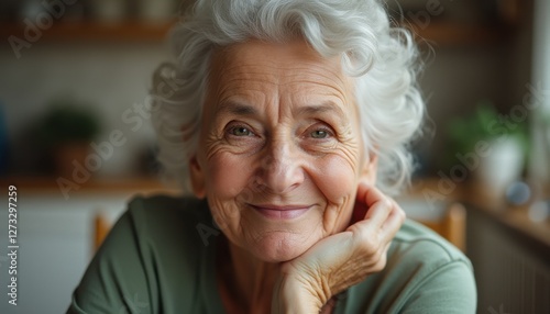 Elderly Caucasian woman displays warmth and wisdom in a cozy indoor setting during daytime hours