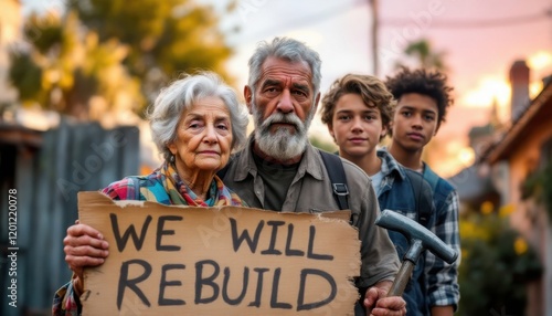 elderly, couple, teenage, rebuild, disaster, caucasian, african, determination, community, support, resilience, strength, hope, oneness, togetherness, teamwork, rebuilding, solidarity, recovery, help, aid, family, hammer, young, mature, adult, children, diverse, mixed race, perseverance, sunset, plaid, beard, grey, hair, signs, fence, home, neighbourhood, future, optimistic, effort, spirit, resolve, bond, companionship, encouragement, inspiration